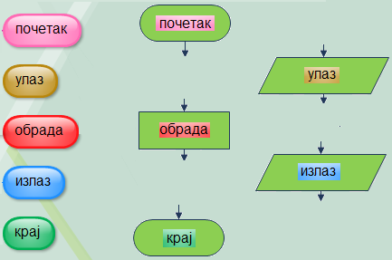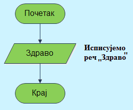 Пример 4. Покушајмо да опишемо дијаграмом алгоритам који исписује поруку ,,Здраво" на екрану.