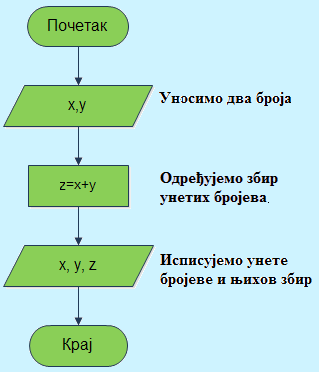 Пример 7. Опишимо дијаграмом алгоритам за сабирање два произвољна броја.