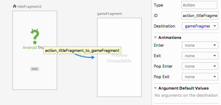 Potom se mora izabrati opcija Create new destination ili se izabere neki od ranije definisanih fragmenata. U prozoru koji se pojavi, kreirati destinaciju. Atributi destinacije mogu da se menjaju u sekciji Attributes unutar Layout Editor. Ključna su sledeća četiri atributa: